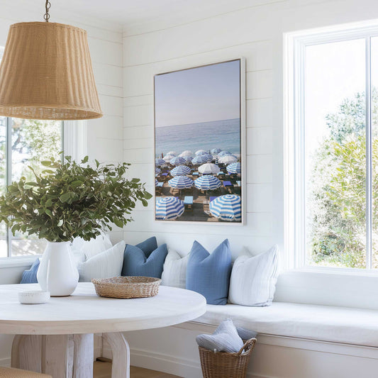 Striped Umbrellas and Bougainvillea by the Sea Canvas Print