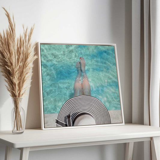 Poolside Legs with Striped Hat and Sparkling Water Canvas Print