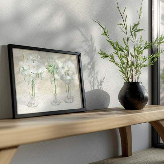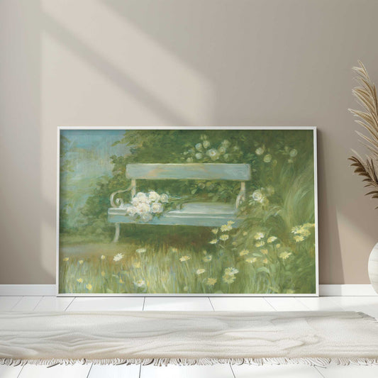 Soft Green Bench with Wildflowers in a Peaceful Garden I Paper Print
