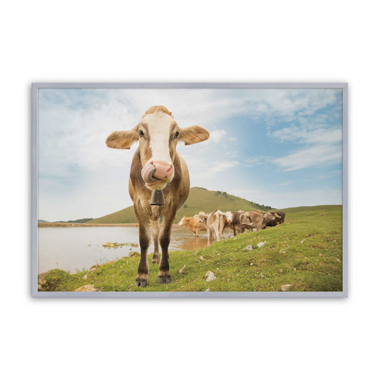 Curious Cow Close-Up with Herd in Scenic Pasture Paper Print