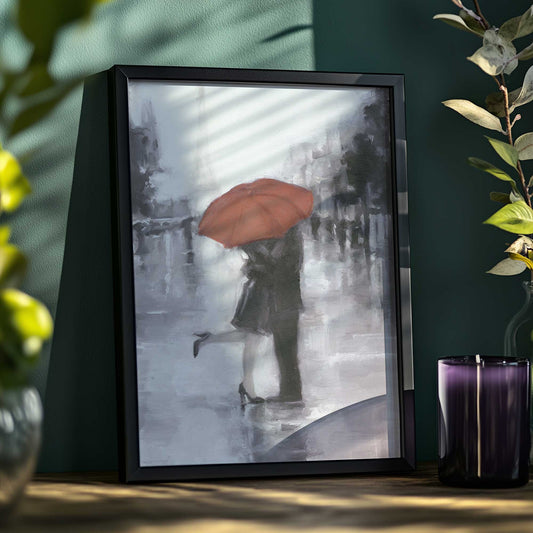 Couple Kissing in Rain with Red Umbrella and Eiffel Tower Art Print