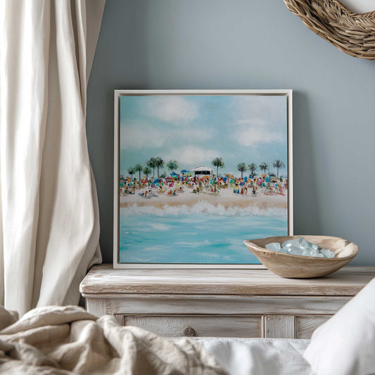 Crowded Beach Party Scene with Palm Trees and Coastal Energy Canvas Print