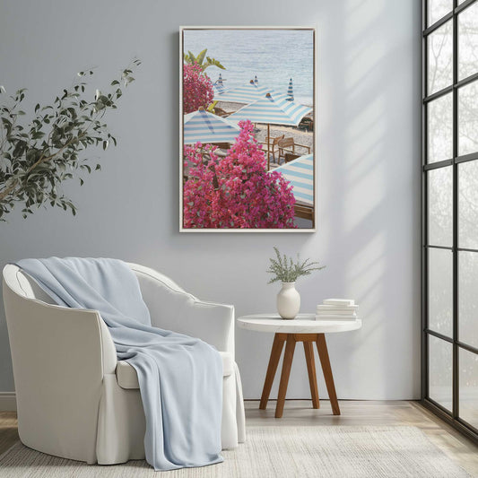 Striped Umbrellas and Bougainvillea by the Sea Canvas Print