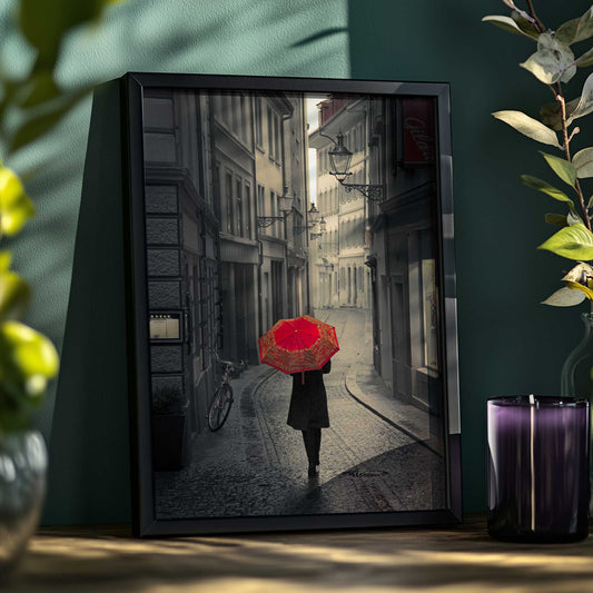 Rainy Alley Walk with Red Umbrella Art Print