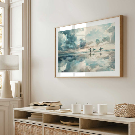 Surfers and Reflections at Dusk Art Print