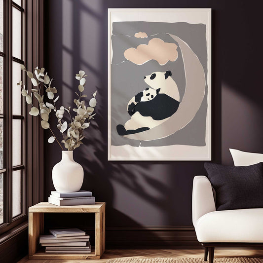 Panda Mama and Baby Cuddled on a Crescent Moon Art Print