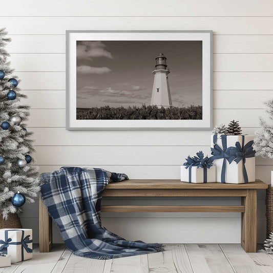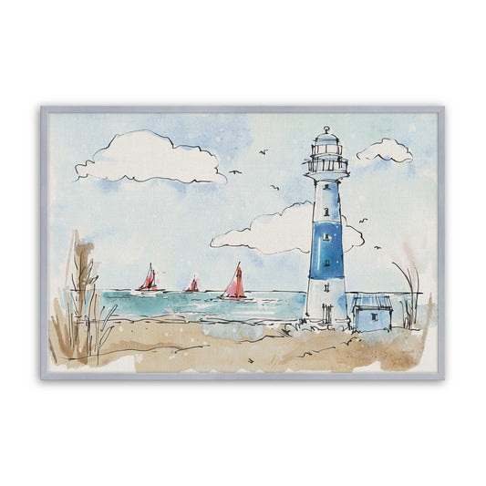 Coastal Lighthouse with Red Sailboats and Breezy Blue Skies Paper Print