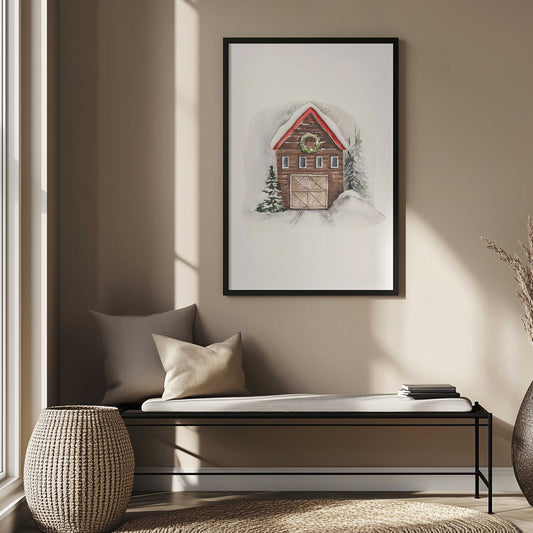 Rustic Holiday Barn with Snow and Wreath Art Print