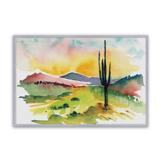 Watercolor Desert Sunset with Tall Cactus and Rolling Hills Paper Print