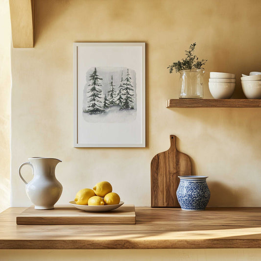 Snowy Evergreen Trees in Watercolor Grey Art Print