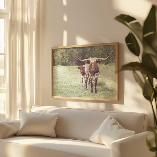 Longhorn and Calf in the Meadow Paper Print