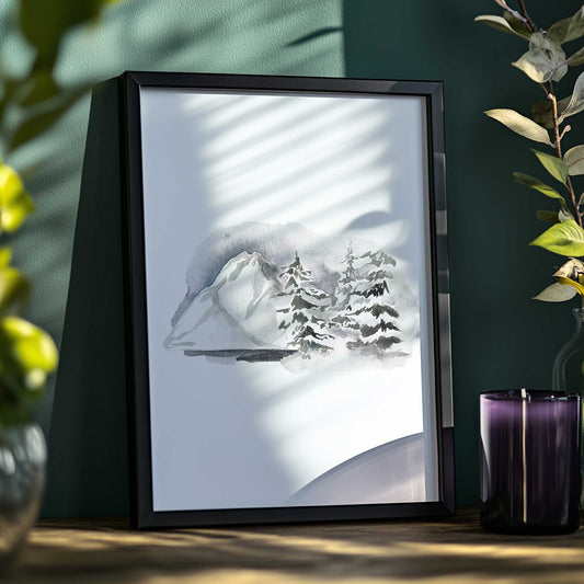 Snowy Mountain and Pine Trees in Watercolor Grey Art Print