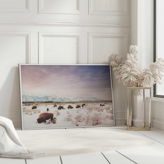 Bison Roaming a Snowy Plain Beneath Purple Skies Art Print