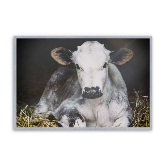 Sweet Baby Calf Lounging in the Hay with Curious Eyes Paper Print
