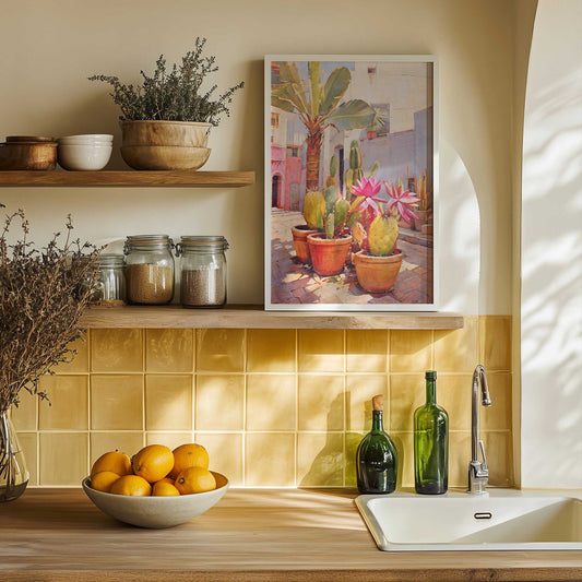 Colorful Courtyard with Cactus Pots and Pink Blooms II Art Print