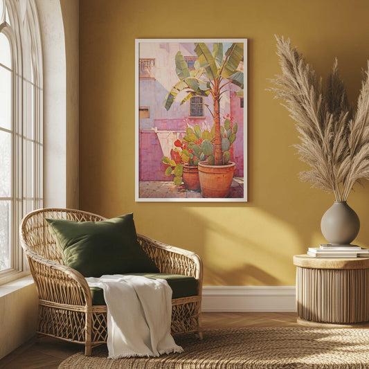 Pink Stucco House with Cactus and Banana Plant Art Print