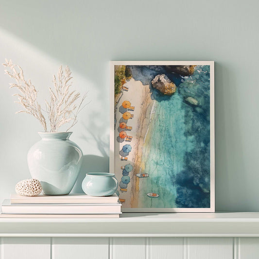 Colorful Beach Umbrellas and Boats from Above Art Print
