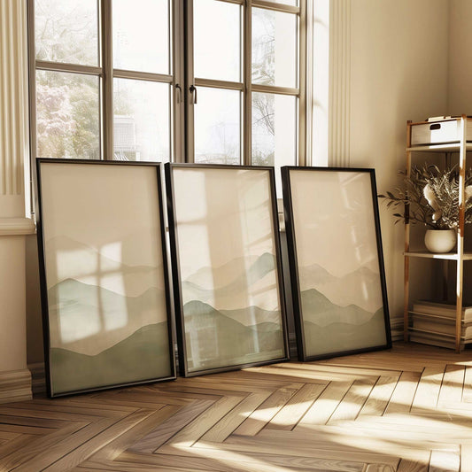 Muted Green Mountain Landscape in Soft Neutrals - Set of 3 Prints