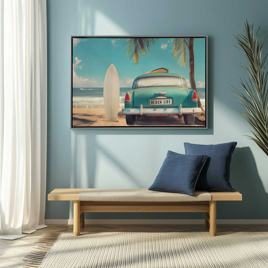 Vintage Beach Car with Surfboard and Palm Trees Canvas Print