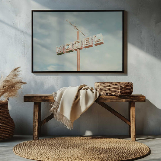 Faded Pink Motel Sign Under Blue Sky Canvas Print