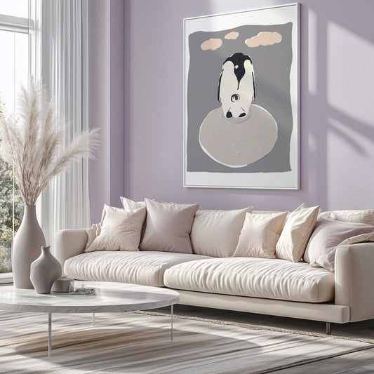 Parent and Baby Penguin Snuggled Under Blush Clouds Art Print