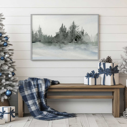 Snowy Evergreen Trees in Watercolor Grey Art Print